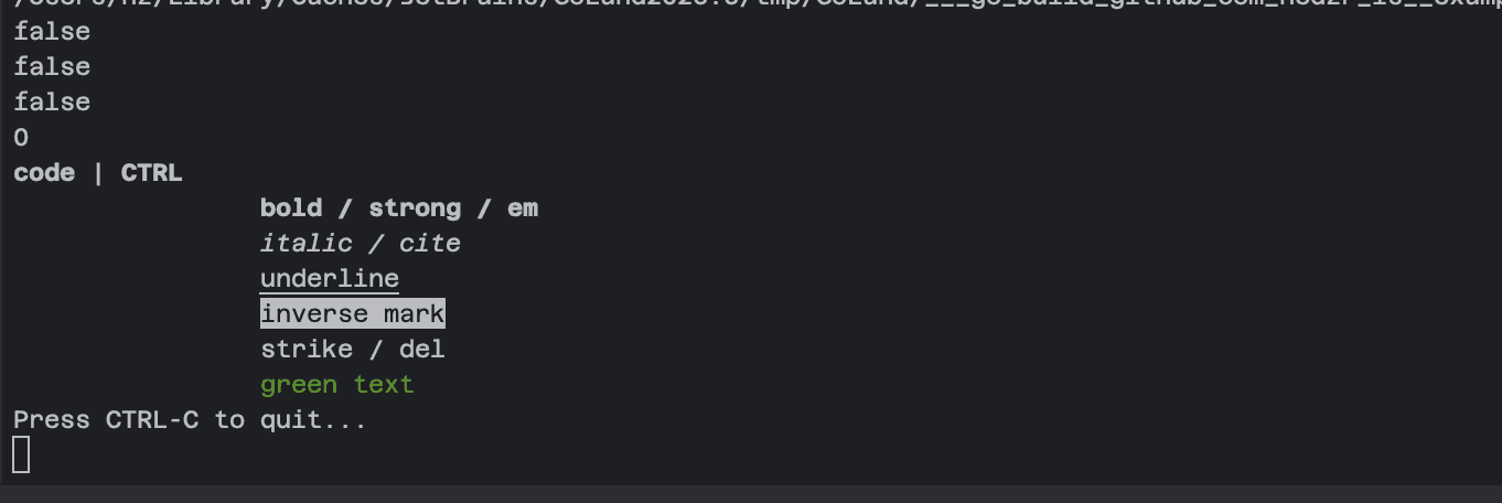 `, color.FgDefault))The corresponding output on a colorful terminal simulator would be:
